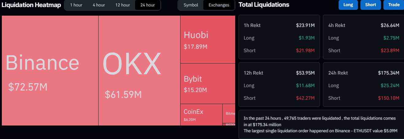 การเพิ่มขึ้นของราคา Bitcoin ครั้งนี้ ทำให้มีการ liquidate มากกว่า 175 ล้านดอลลาร์ การ liquidate ส่วนใหญ่ มาจากการ Short ซึ่งมีมูลค่ารวมกว่า 150 ล้านดอลลาร์ Binance บันทึกการ liquidate มากที่สุดที่ 72.57 ล้านดอลลาร์ รองลงมาคือ OKX ที่ 61.59 ล้านดอลลาร์