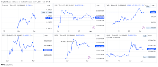 หลังจาก Bitcoin ได้พุ่งขึ้นเหรียญมีม Dogecoin (DOGE) ก็เพิ่มขึ้นถึง 6% และ Shiba Inu (SHIB) เพิ่มขึ้นเกือบ 8% รวมถึงเหรียญมีมอื่นๆ อย่าง Dogwifhat (WIF), Pepe (PEPE) และ Bonk Inu (BONK) ที่เพื่มขึ้นวันละ 4% ก็ค่อยๆ วิ่งตาม Bitcoin ไปเรื่อยๆ